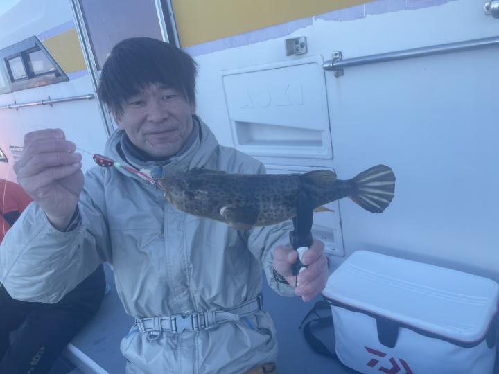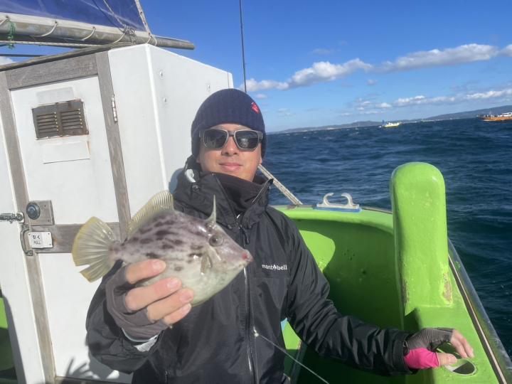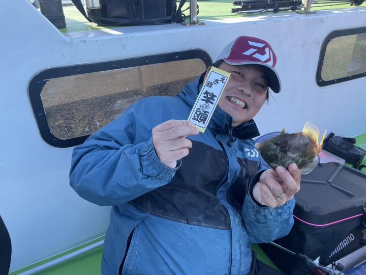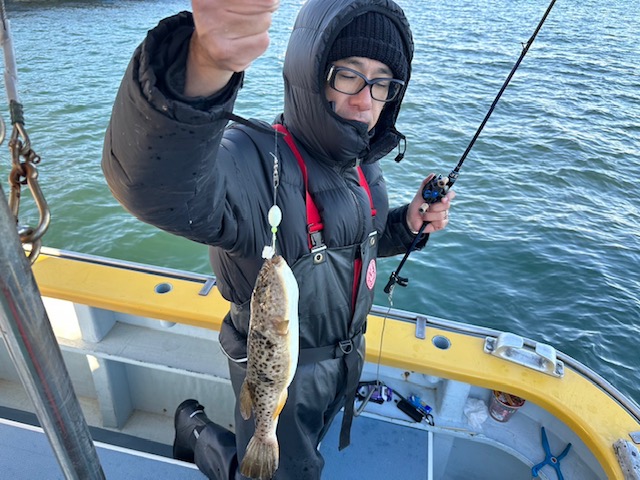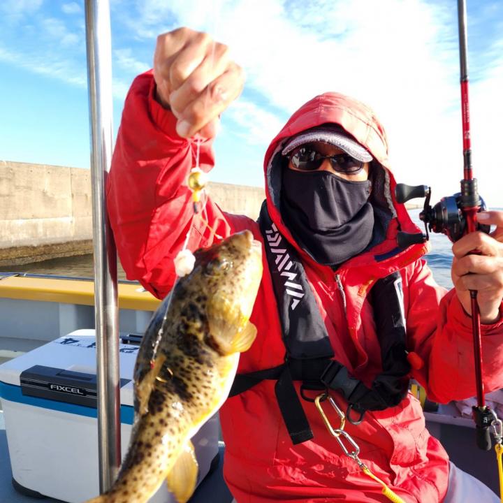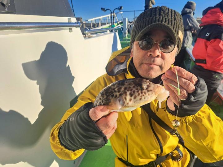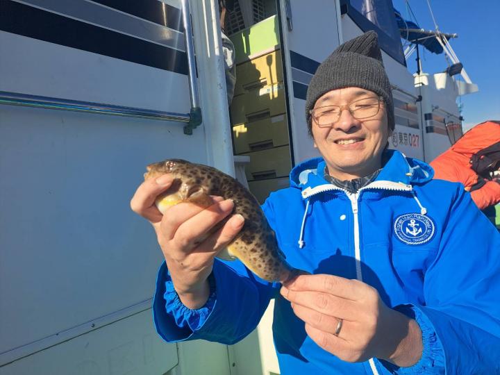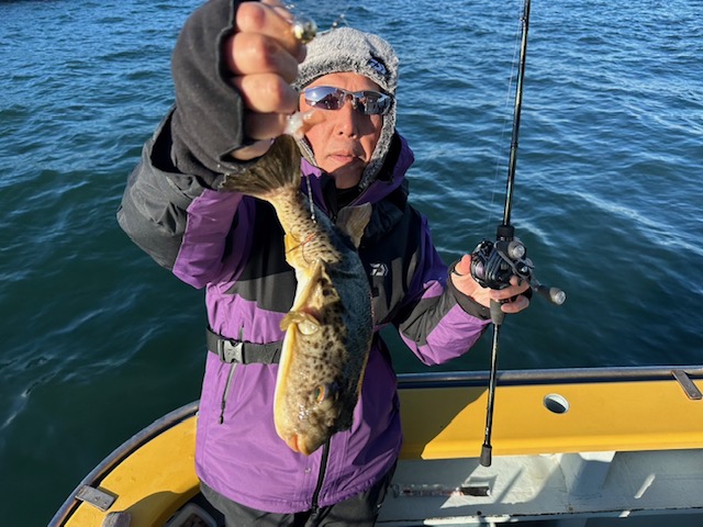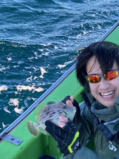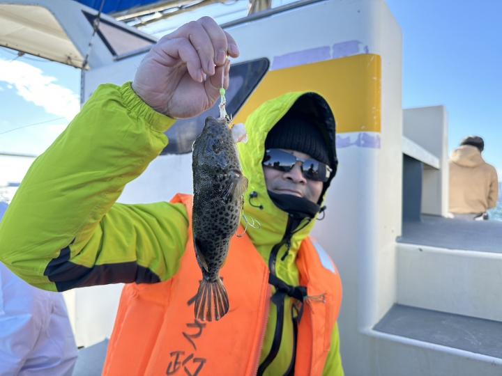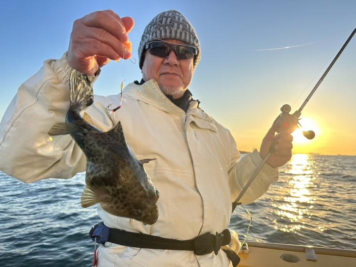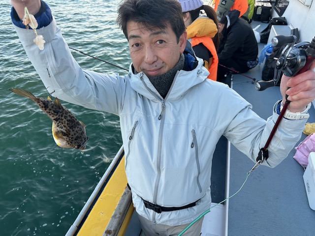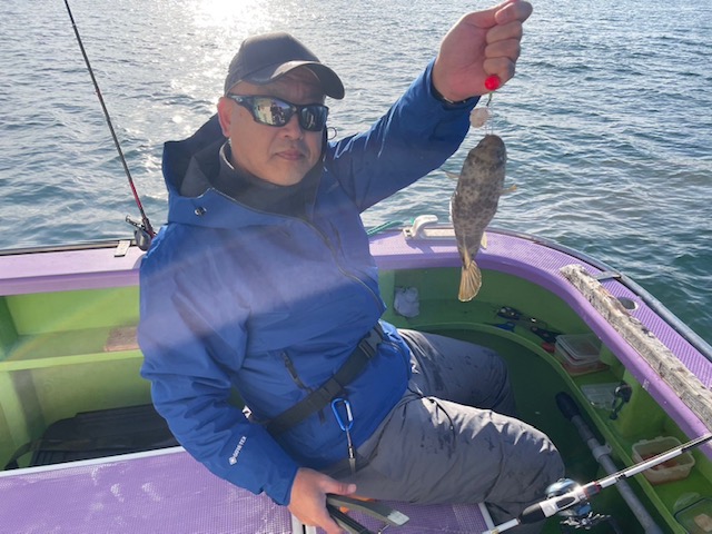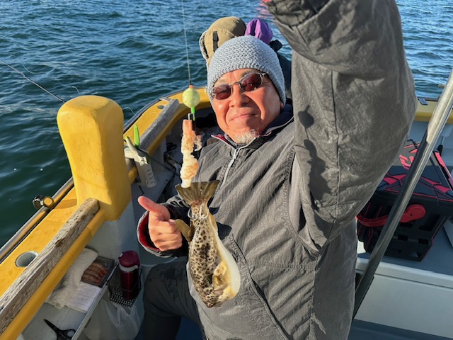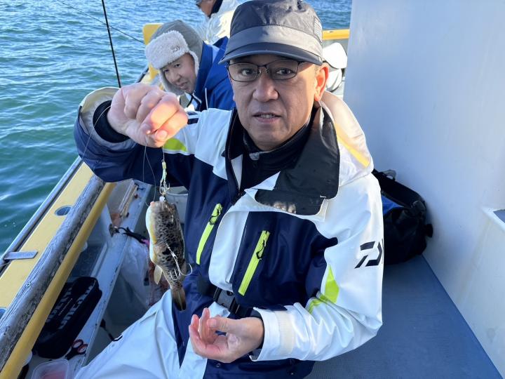 開始早々、フグ釣り初挑戦のお客様がゲット〜!いきなりテンション上がりました。その後はどうにか型を見る程度でアッチコッチ探索しましたが良い所なく全員ゲットならずスミマセンでした。