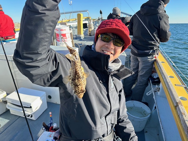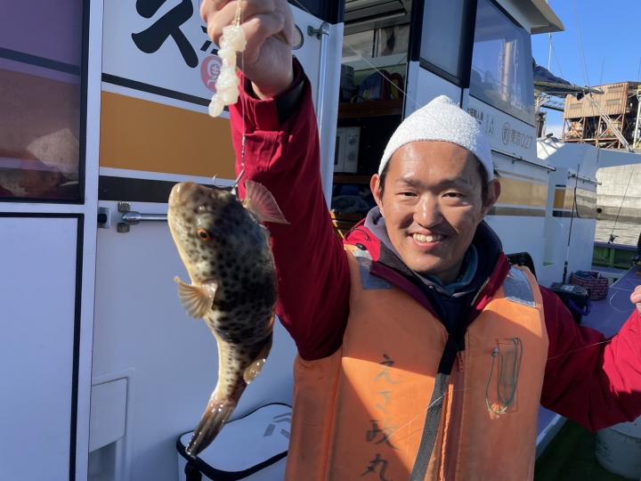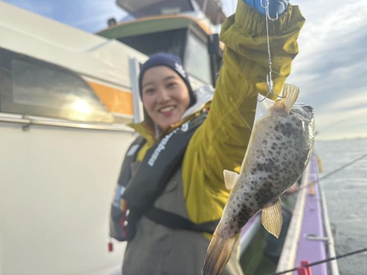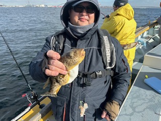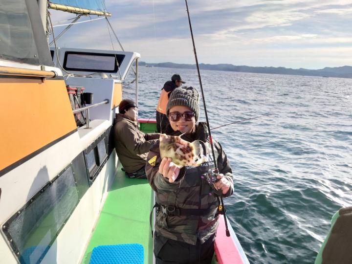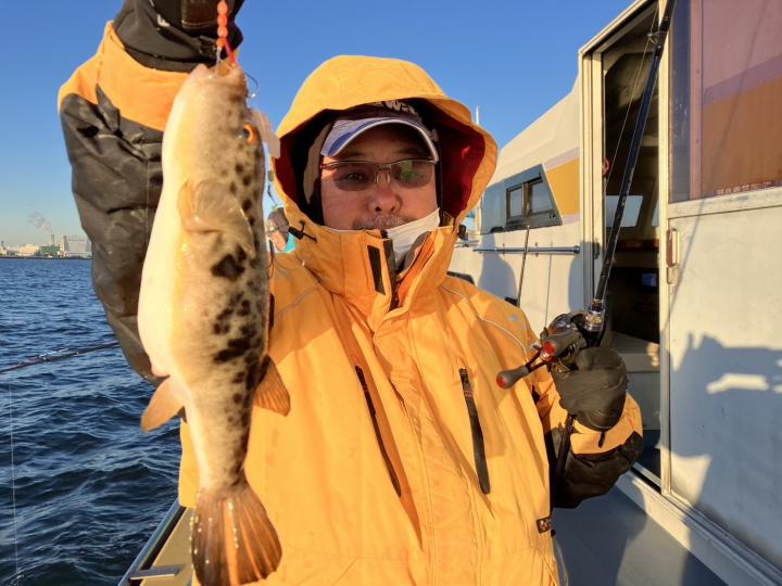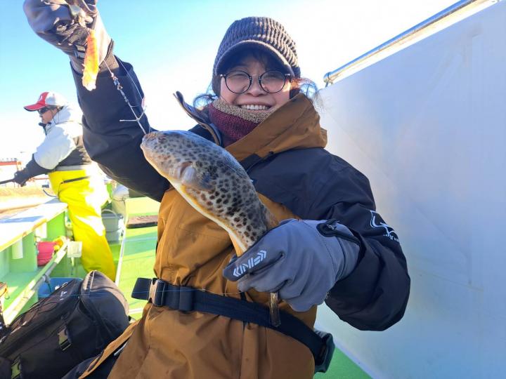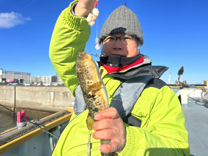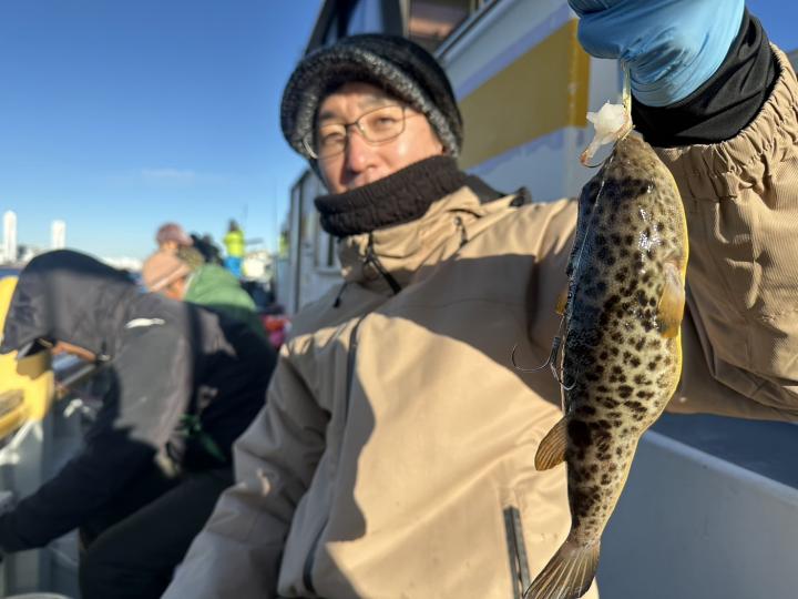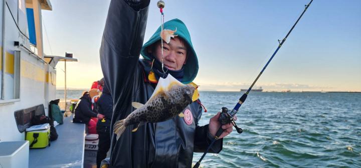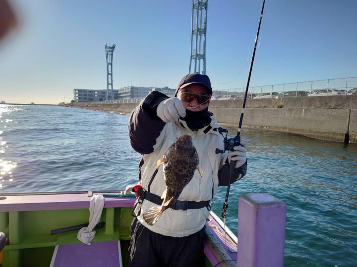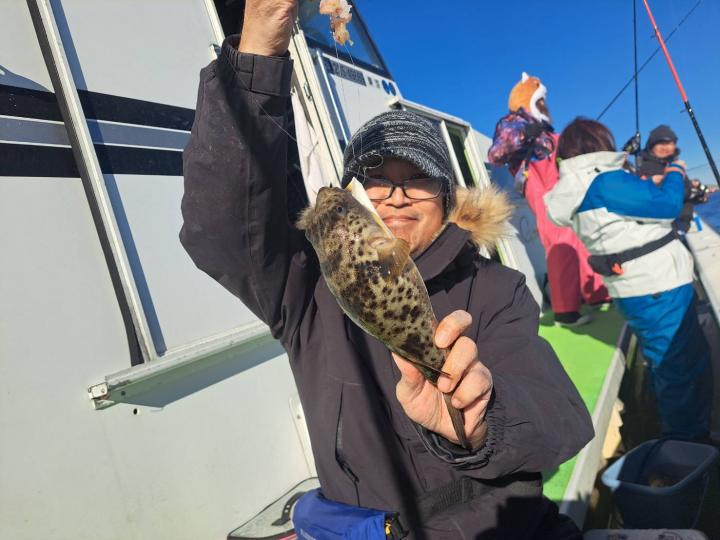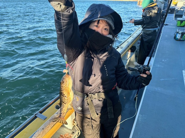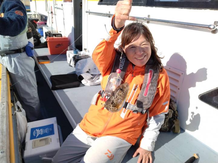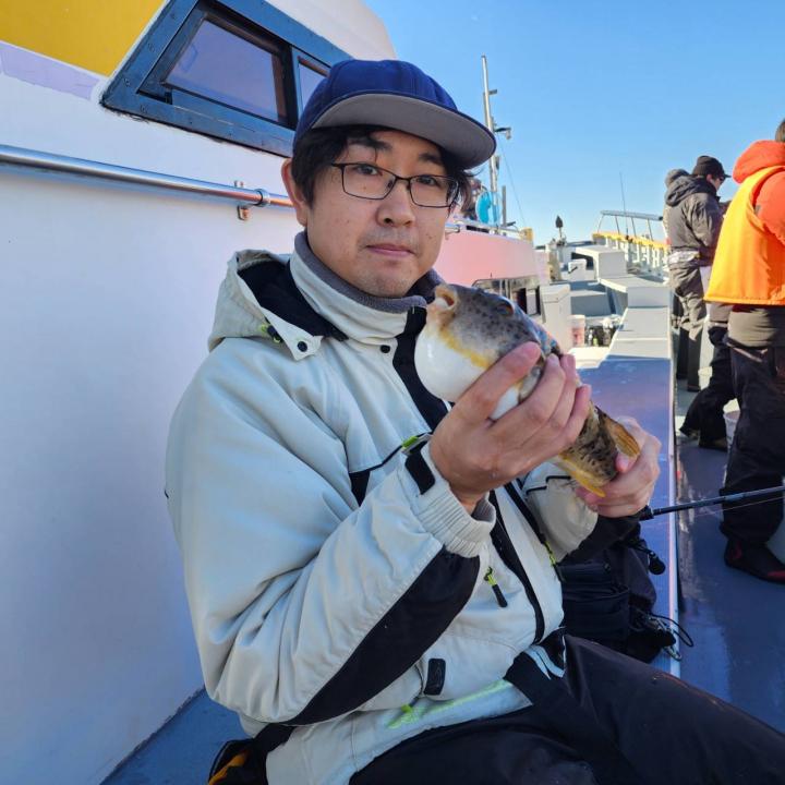 開始早々、フグ釣り初挑戦のお客様がゲット〜!いきなりテンション上がりました。その後はどうにか型を見る程度でアッチコッチ探索しましたが良い所なく全員ゲットならずスミマセンでした。